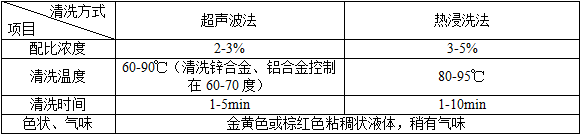備注:溶液配制:加水于干凈的槽中,加熱 35-40℃左右,在攪拌下緩緩地加入所需的除蠟水,因除蠟水較難溶解,需要充分攪拌均勻后升溫至需要的工作溫度即可以使用。