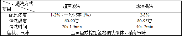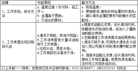 備注:溶液配制:加水于干凈的槽中,加熱 35-40℃左右,在攪拌下緩緩地加入所需的除蠟水,因除蠟水較難溶解,需要充分攪拌均勻后升溫至需要的工作溫度即可以使用。