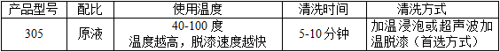 需脫漆的工件→本品脫漆處理→5%左右的弱酸(磷酸、檸檬酸、草酸)中和→漂洗(為能徹底清除殘留藥劑,最好用超聲波漂洗或噴淋漂洗多次)→干燥→接后工序。