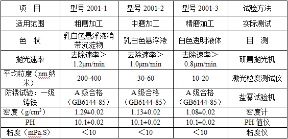 2、型號:2001金屬研磨拋光液,分三種型號:2001-1(粗磨),2001-2(中磨),2001-3(精磨)